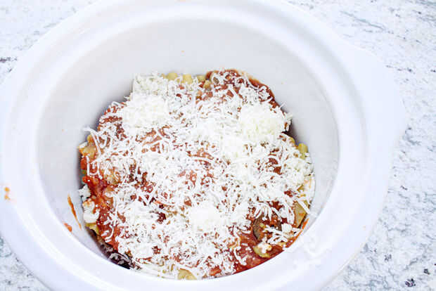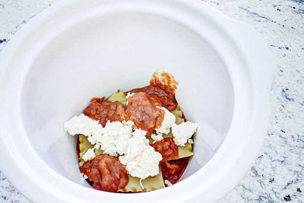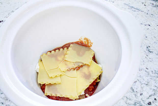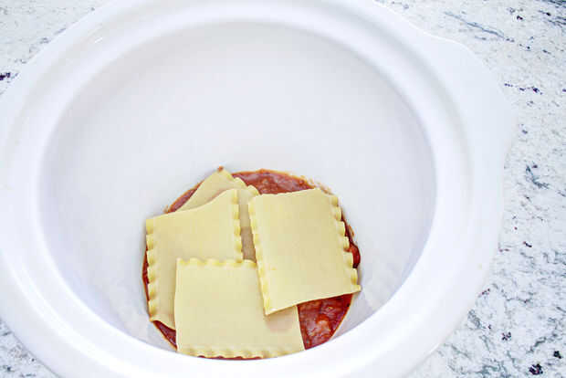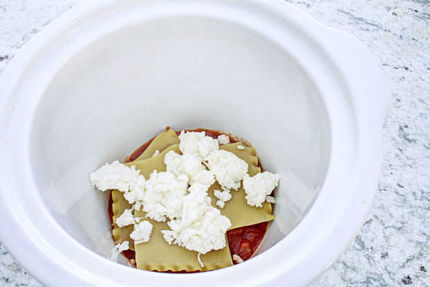 Superior primero esta lasaña con la salsa restante de un frasco y luego el queso relleno. No necesita tener salsa flotante a la capa superior.