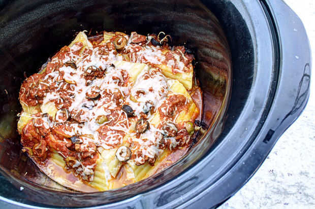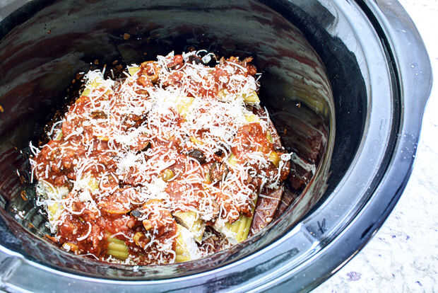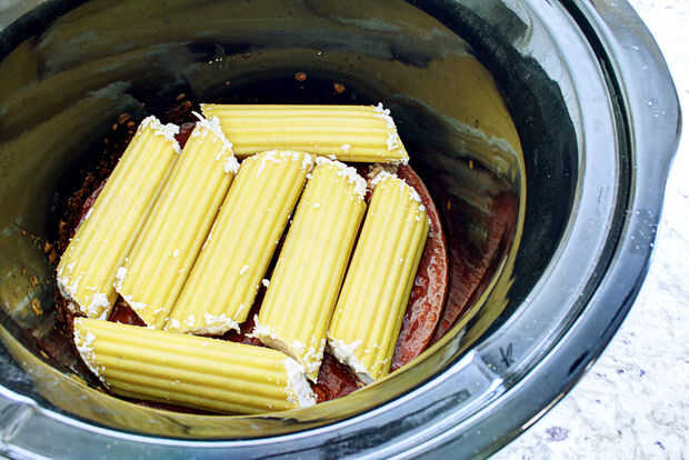 Estos manicotti de corte diagonal se prestan mejor a la cocina a sus lados. Si usted puede encontrar manicotti de plano de corte, usted puede cocinarlos vertical en una olla lenta de taller.