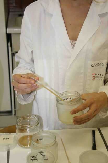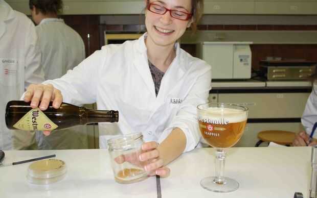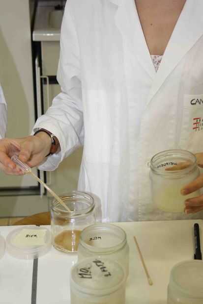 La botella fue lentamente decantada, la levadura residual se vierte en un vaso de precipitados y parte se pipetea en el medio de crecimiento