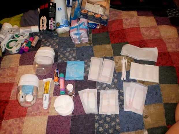Tengo varias vendas autoadhesivas, unas cintas de mariposa si las cosas ponen grave, antibióticos crema, un rollo de antiácidos, una toalla desechable, un mini cojín, clavo clippers, cojines de algodón, bálsamo para los labios y unos audífonos de algodón. También guardo una botella de viaje tamaño de desinfectante de la mano ya en el coche y generalmente hemos agua embotellada también.