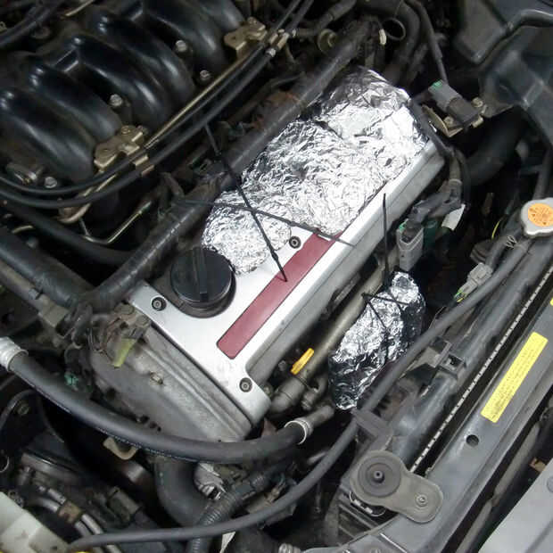 Cuando ha satisfecho que ha encontrado un lugar adecuado en el lugar de compartimiento de motor su hoja envuelta alimentos y asegure con ataduras de cremallera. El método de asegurar que la fuente de calor depende de usted y puede no ser necesario. La ubicación que utiliza consiguió bastante caliente para cocinar mi comida, pero no lo suficiente para derretir los lazos zip.