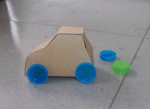 Paso 7: Pegar las 4 tapas de las botellas viejas en el coche de las ruedas. Puede usar las clavijas para meter las ruedas en el coche.