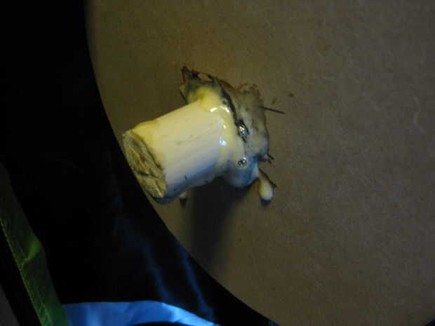 Una vez hecho esto, pegamento (gorila) las ruedas sobre el taco una vez que tengas la espiga también corte a la longitud correcta e inserta a través de los agujeros en el coche.