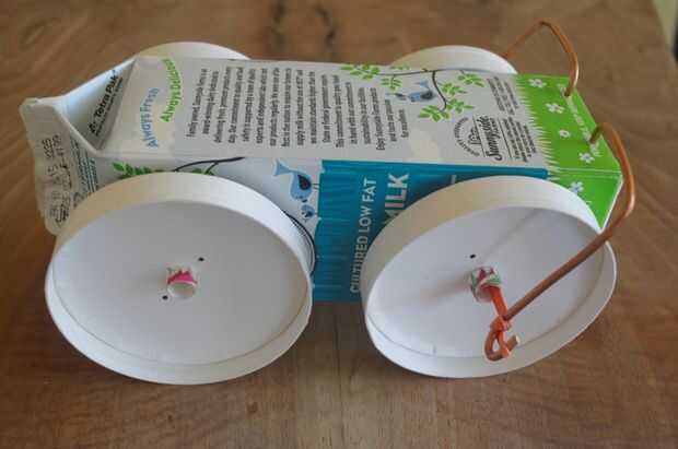 Este es un juguete: banda caucho accionado coche hecha de botella de papel mantequilla.