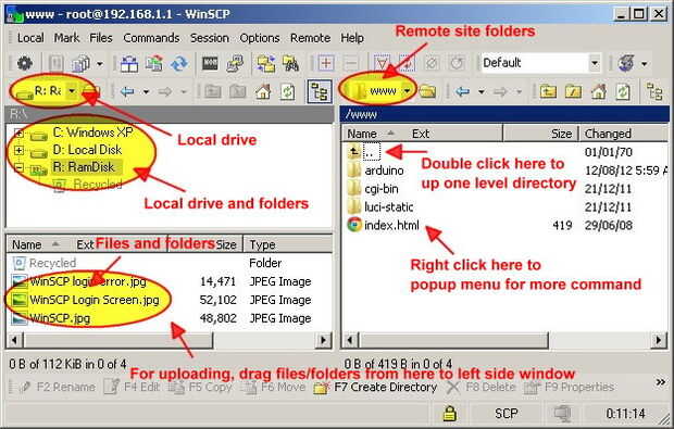 WinSCP es un cliente SFTP/FTP/WebDAV/SCP para Microsoft Windows que permite transferir archivos y administrar carpetas entre el ordenador y router.