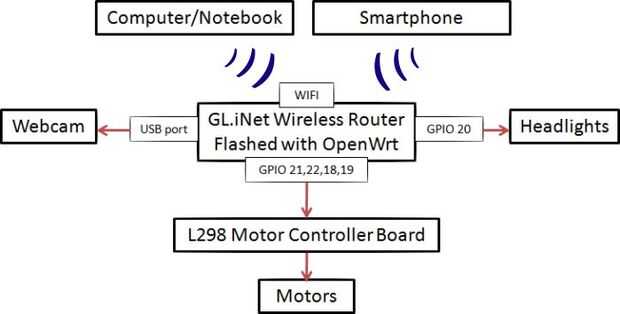 Como se muestra en el diagrama de bloques, todo está controlado por un router inalámbrico, la webcam se conecta al router inalámbrico via puerto USB que permite streaming de vídeo en vivo, la tarjeta controladora de motor es conectada directamente al router via GPIO para controlar los motores sin el uso de un microcontrolador.
