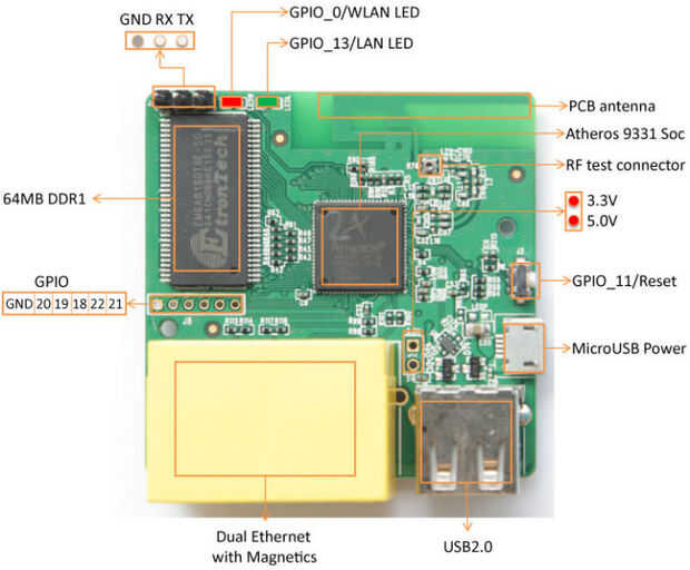 Elegí el GL.iNet 6416A para este proyecto ya que es un router inalámbrico extremadamente pequeño (dimensión: 58 * 58 * 22 mm), la 5 GPIOs y puerto serie sin embargo son fácilmente accesibles a través de agujeros o encabezados.