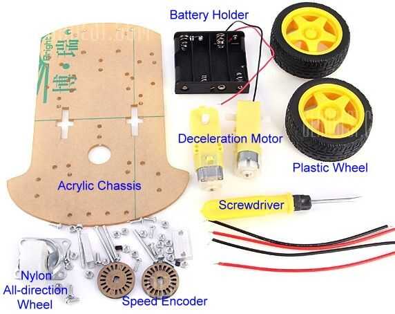 El juego incluye dos motores de desaceleración, dos ruedas de plástico, un portapilas para baterías 4xAA, y también hay codificador de dos velocidades que no estoy usando.
