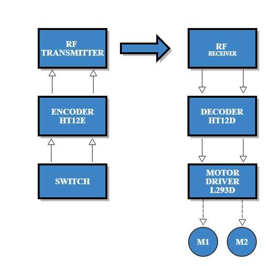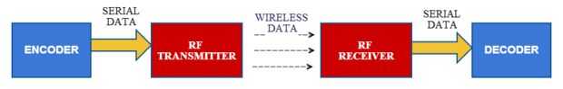 El módulo de RF se utiliza junto con un par de codificador y decodificador. El codificador se utiliza para la codificación de datos en paralelo para la transmisión de alimentación mientras que la recepción es decodificada por un decodificador. HT12E HT12D