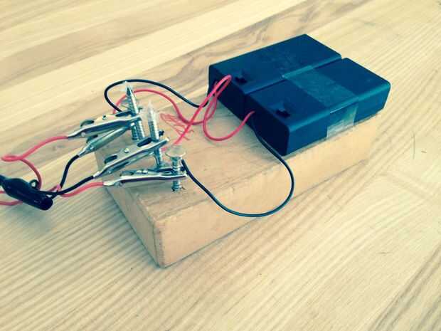 9. por último, conectar los cables de regulares a las uñas (los cables negros deben fijarse a los clavos que fueron martillados, y el cable rojo debe estar conectado a los clavos que estaban pegados en caliente).