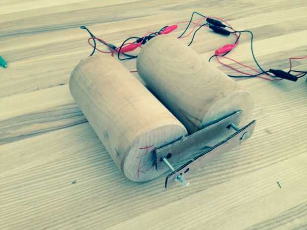 1. después de conectar los cables a los motores en los cilindros, tomar cada bloque de cilindro y coloque 1 clavo al otro lado de los bloques de dos cilindros (Asegúrese de que el clavo está en el centro del lado de cada bloque).
