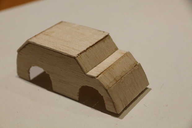 Medir la parte delantera del coche. Para obtener otra pieza de madera de balsa cortada a las dimensiones de la parte delantera del coche luego pegamento en la parte delantera del coche.