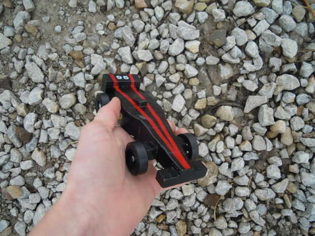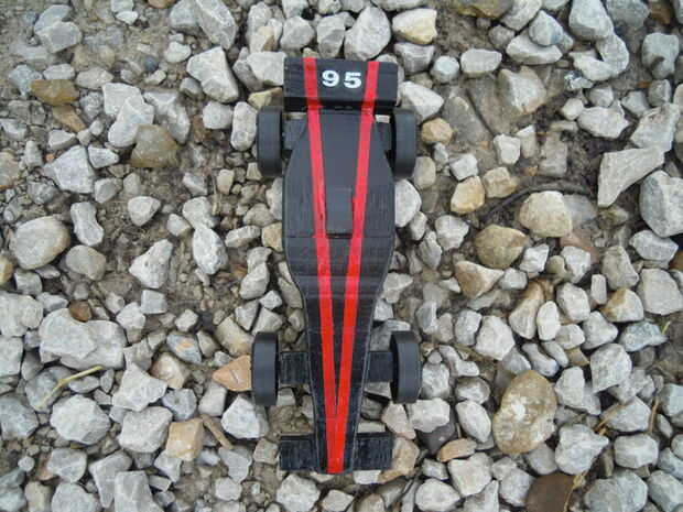 Mi hermano me ayudó a trazar el diseño en el bloque de pino, luego hice el corte. También me ayudó a poner en la cinta adhesiva, fije las ruedas y agregar el peso. Al principio pensé que podría hacer un camión, entonces me decidí a hacer el piloto de F1 en su lugar.