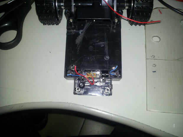 En el polo negativo de la batería, yo sólo soldado a un tornillo en la parte superior la caja plástica. Para el borne positivo, había soldado el interruptor on/off, y al otro lado del interruptor en el cable rojo, que también fue soldado a otro tornillo en la caja de plástico. Esto me permitió tener 2 postes positivos y negativos básicos a utilizar en la parte superior de la cubierta de plástico.