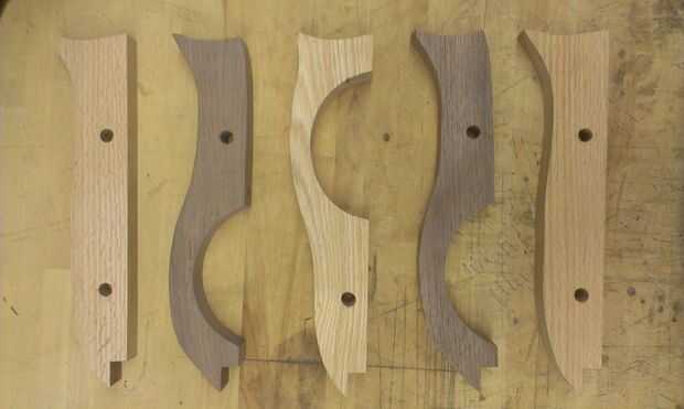 luego corte los radios de la parte inferior perforaron los agujeros y corte las dos gruesas piezas por la mitad, para que las dos piezas exteriores de cada lado eran simétricas.