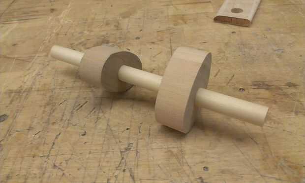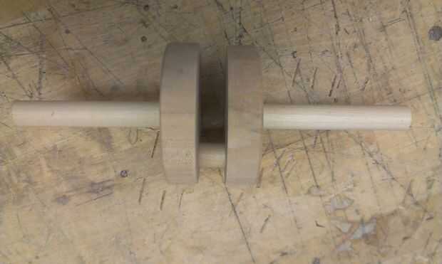 entonces trabajaba en la fabricación de los mecanismos de las levas comencé con un par de ruedas de madera y cortar y lijar a trabajar como porno. para la manivela tomé dos ruedas de madera y lijar para hacerlos más delgados, perforar un segundo agujero en ellos y cortar la espiga a la especificación correcta. para la pieza en la manivela que se mueve fuera de juguete, encontré un trozo de arce rizado y cortar una aleta como forma.