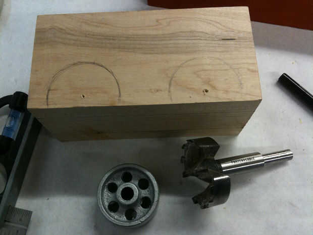 Usando la broca Forstner en el taladro, desglosar el grosor de las ruedas usando los agujeros de pequeño diámetro que ha perforado previamente como marcas. Girar el bloque y luego taladre dos orificios más, otra vez usando los agujeros de pequeño diámetro como marcas.