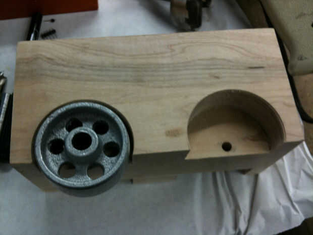 Con la rueda, marque con un lápiz donde en el bloque de madera quiere colocar. Marque el centro de la rueda con un clavo o tornillo. El centro de la rueda debe tener al menos 1/4" de material debajo de él. Hacer esto para solamente las dos ruedas en un lado.