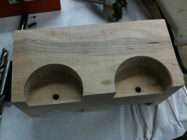 Usando la broca de diámetro más pequeño en una prensa del taladro, perfore todo el camino a través del bloque de la madera en los dos puntos que marcaste.