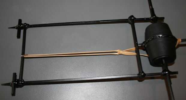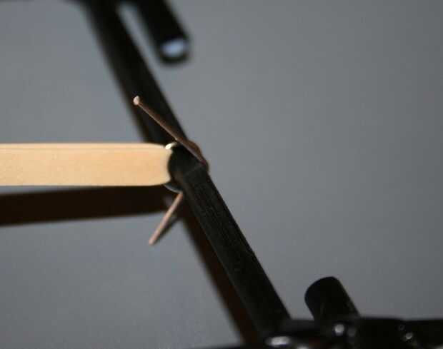 Conecte el otro extremo de la goma hacia el lado opuesto del chasis usando un trozo de alambre doblado (a partir de un clip). Ahora debe capaz de ser estirado cuando se gira el brazo de palanca.