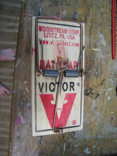 trampas de rata debe revisarse con frecuencia para la eliminación, pero a menudo están ocultas a la vista en el ático. Me di cuenta que podía hacer solo un simple palo normalmente cerrado interruptor soldando los cables a la barra de disparo y la bar