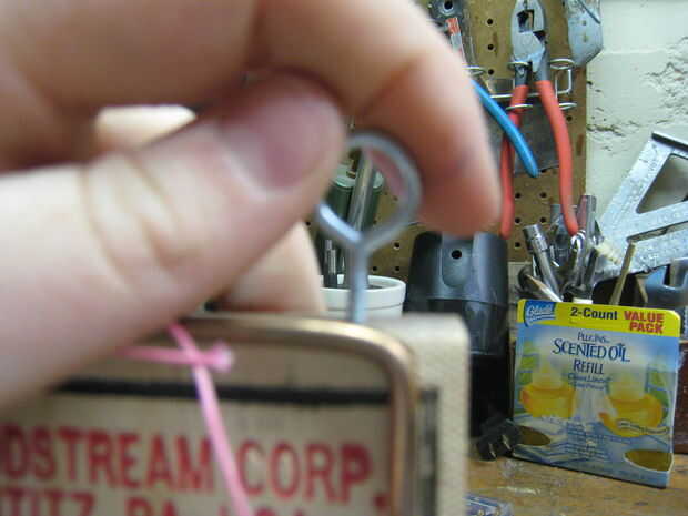 Tornillo en los ganchos de ojo en los cuatro orificios realizados en el último paso. Asegúrese de que los ganchos estén perpendiculares al fondo de la trampa