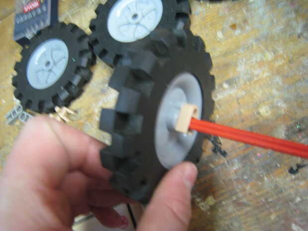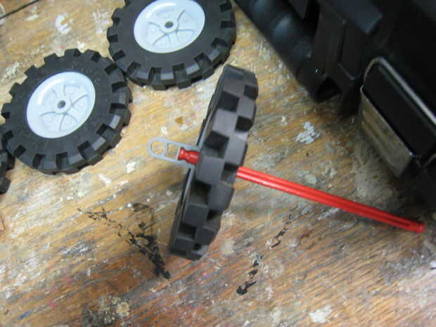 Ahora es el momento para hacer el eje delantero. Conseguir una de las barras del rojo y poner un conector gris en el extremo. Luego deslice una de las ruedas y enganche un conector tan detrás de la diapositiva de la rueda esta en el conjunto a bloquear la rueda a la barra. Ahora deslice el eje a través de los ganchos de ojo en la parte delantera (el extremo con la barra abajo de cuando no en uso) a continuación ponga el otro extremo de la varilla (el uno sin la rueda) a través del siguiente gancho de ojo. Poner la segunda rueda en el método anterior. Ya listo con el eje delantero.