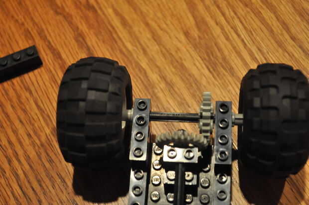poner el eje sólo a través de la pieza posterior y poner el otro engranaje en y la otra rueda en el otro lado y ajustar engranajes según sea necesario