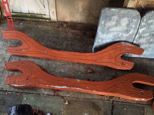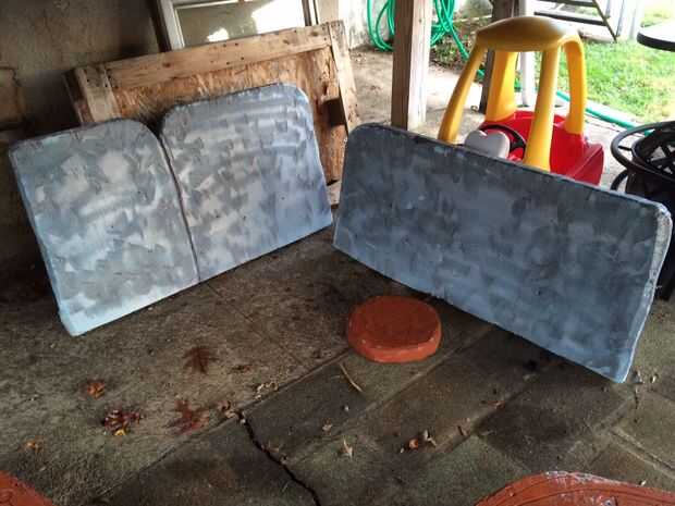 Pintura de aerosol de la madera con un color marrón orangy y los asientos con piedra o pintura "martillado". Pintura de aerosol se funda espuma que realmente añade el detalle rústico.