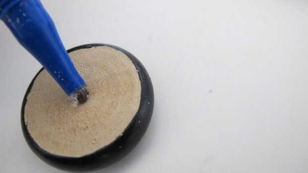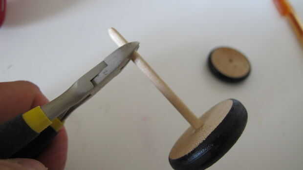 Corté dos espigas (yo usé 5mm) y empujado a través de los agujeros. Pegar sólo las ruedas a la espiga. Asegúrese de que ese taco no es pegado al cuerpo del coche, porque quieres las ruedas al girar.