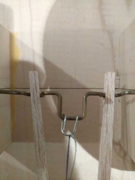 Tomar un clip, forman un accesorio en orden para el hilo de rosca girar libremente alrededor del árbol (ver foto arriba). Utilice unas tijeras para cortar cualquier exceso de material. El clip debe ser seguro, sin embargo capaz de girar libremente. Tensar el hilo y atar firmemente en el soporte de clip. Corte cualquier exceso de hilo con unas tijeras.