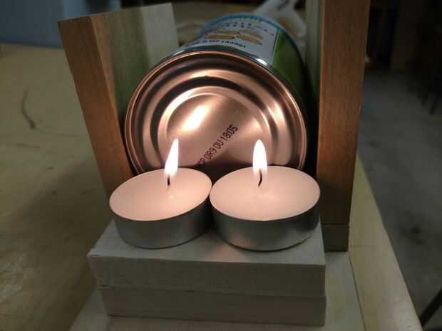 A continuación, pegue dos velas de té al lado de encima de la estructura de soporte. Idealmente, las llamas deben colocarse muy cerca del centro de la base de la lata, como se muestra arriba. Tenga cuidado de evitar la quema a sí mismo como luz las velas.
