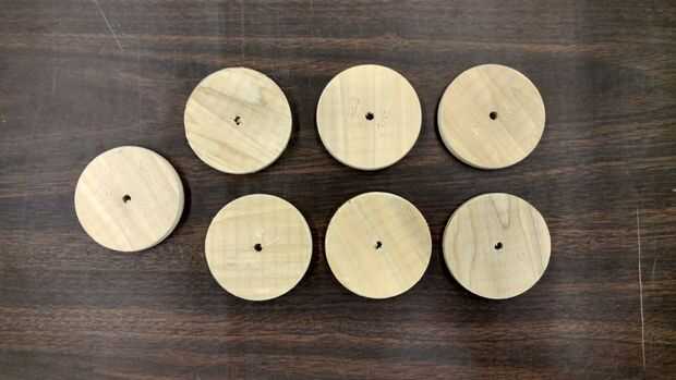 Con el serrucho (utilice una sierra de bits que es apenas más pequeño que la abertura de la lata), corte 7 cilindros fuera de la madera de balsa. Unir estos cilindros, uno directamente encima de otro y deje que se seque (con abrazaderas voluntad probable ayuda para acelerar el proceso de secado).