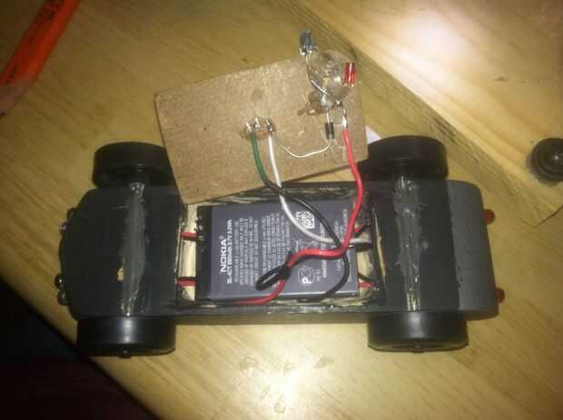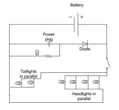 Había construido este coche con baterías de uso individual. Cuando las baterías murieron fue inútil. Decidí reconstruir el circuito con una forma de batería de un teléfono antiguo. También obtenido el enchufe de teléfono así que puedo usar el cargador del teléfono para recargar la batería. Hice un diagrama del circuito para mostrar el circuito. Hay un extra LED que se ilumina cuando se conecta en el cable de alimentación. He puesto la clavija de red en el borde de la cubierta inferior.