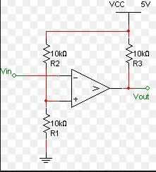 Para aplicar una señal de 5V, es útil usar un comparador. El comparador cuádruple usado en este proyecto tiene cuatro comparadores individuales. Ya que estamos construyendo dos puentes de H, tenemos cuatro entradas total. Vamos a utilizar un comparador por entrada. La función comparadores tomando un voltaje de entrada arbitrario y si está por encima de cierto umbral, la salida de 5V. Podemos diseñar el umbral para ser lo que es conveniente para el proyecto. Esto facilitará las entradas a los puentes de H de la fuente. Foto de arriba es un comparador básico esquemático.