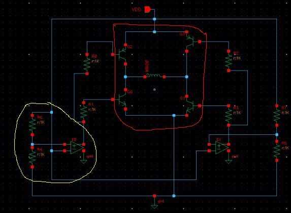 Ahora que usted comprende los componentes básicos, puede montar el circuito en coche. En la mitad superior de tu protoboard, arme el circuito mostrado arriba. Nota el puente H en un círculo en rojo, y el comparador un círculo amarillo.