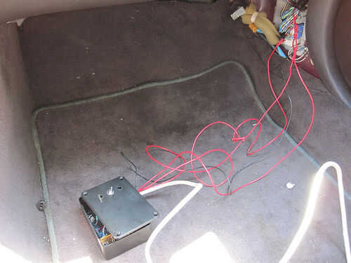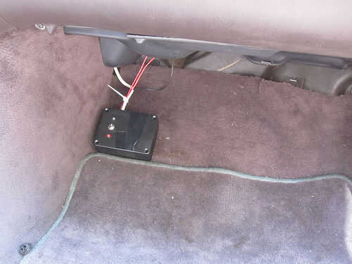 Una vez que todo está montado debe ser colocado en el coche, he decidido no ocultar realmente el cuadro, aunque sería fácil poner debajo de un asiento o algo como eso pero más bien mía es en el pie de lado del pasajero. Utiliza una constantemente en línea de 12v para alimentar a la unidad y con conexión a tierra al chasis del coche. Otra razón dejé expuesta es aunque el sistema solamente dibuja una cantidad muy pequeña de energía si tuviera que ser aparcados en algún lugar durante mucho tiempo me gustaría ser capaz de dar vuelta apagado (interruptor en la parte superior) para evitar la descarga de la batería de exceso.