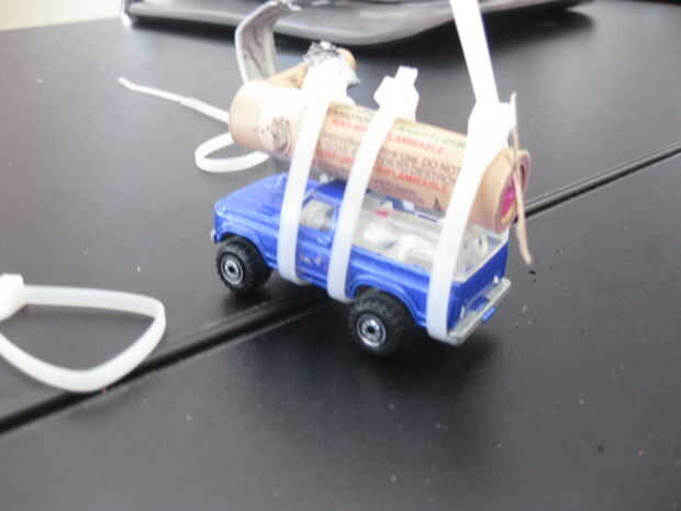 Tomar su coche y decide donde usted quisiera que su tubo de paja/pluma para ir. Tal vez a través de las ventanas o en el lado. Debe ser paralela a cómo rueda el coche. pegamento en su lugar. Luego colocar el cohete en el coche así. Preferentemente en la parte superior. Pegamento, cinta y zip amarre para asegurarse de que no vuelan.