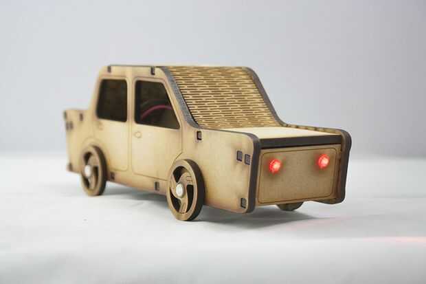 Este es uno de los proyectos más complejos en la serie de mi calendario de Adviento de corte láser.Es un pequeño vehículo de juguete con ruedas tres, propulsada por una goma.También es uno de los proyectos que hice cuando era artista en residencia en