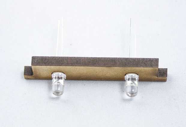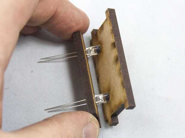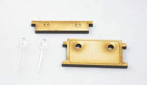 Empezar con el desplazamiento de las patas de los LEDs a través de los agujeros pequeños y colocarlos como en imagen dos. Entonces ponen la parte en la pieza delantera y trasera. Los titulares de LED están marcados con Fram (delantero) y Bak (espalda) así como LED. La parte delantera del coche es el más pequeño de los dos y la parte posterior es la más grande. Por lo tanto sólo cabrán en la ranura derecha del lado del coche. No se puede hacer mal :)