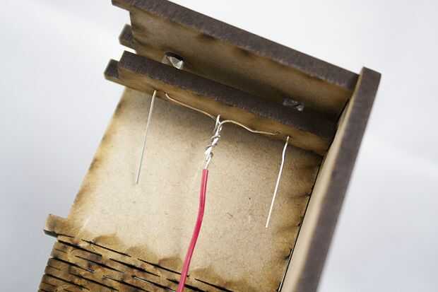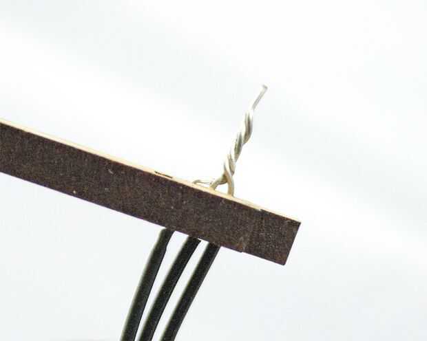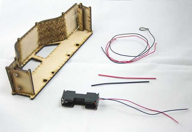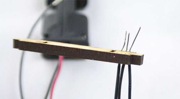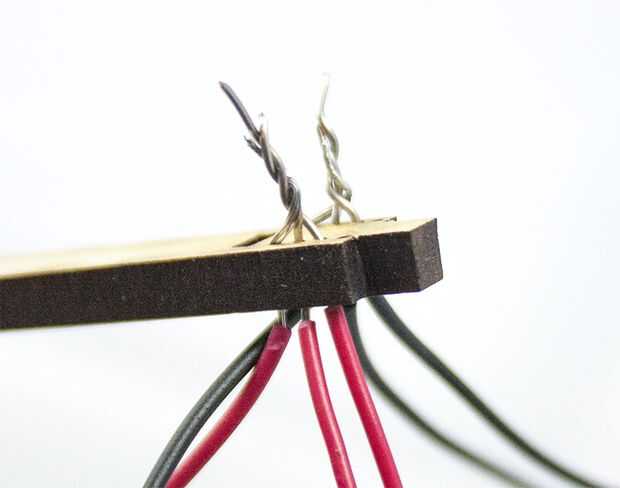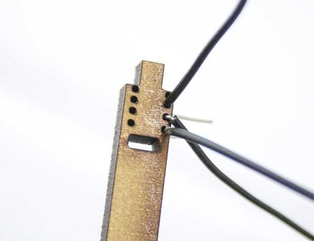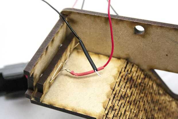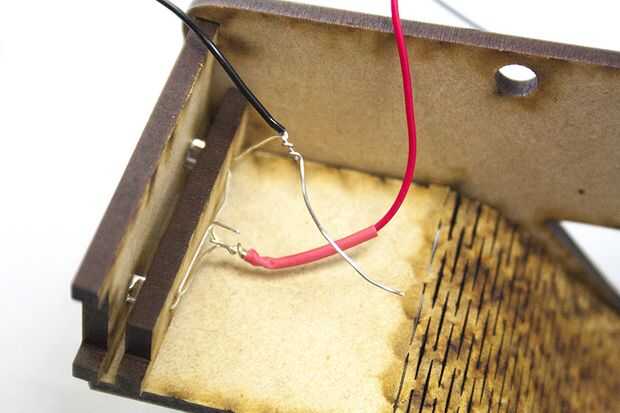 Cuando tome el otro extremo de los cables y los hilos a través de los agujeros pequeños en el pedazo MDF (imagen 5-6) hacer lo mismo con el cable de la batería (cuadro 7-9) y giro/soldadura blanda les juntos. Hay un agujero extra la posibilidad de agregar un interruptor de encendido/apagado pero que no está cubierto en nuestra guía.