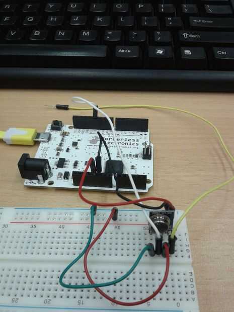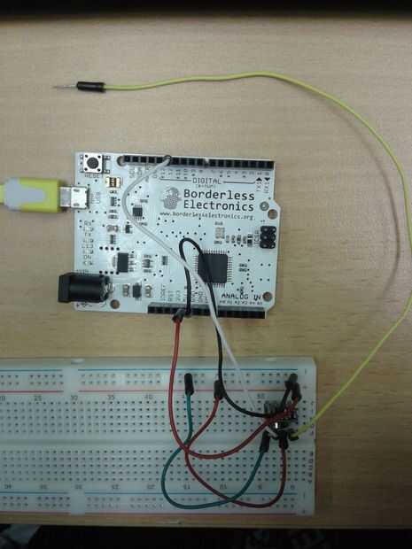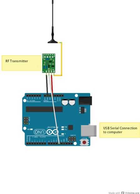 Coloque el transmisor en protoboard y alambre a los pines de masa y 5V al suelo correspondiente y 5V en el Ardunio. Los datos del pin deben conectarse al pin 12 en el Arduino. La antena es opcional pero para tener mayor alcance, simplemente conecte un cable largo y dejarlo colgando.