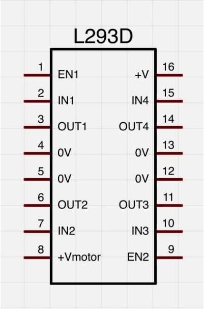 Los pins en el chip L293D se muestran en el diagrama anterior. En1 y EN2 son las patillas del motor permita. Actúan como un maestro de encendido/apagado para cada motor. In1, IN2, IN3 y IN4 son las entradas que controlan las direcciones de cada motor. Si es alimentado IN1 y IN2 no es, el motor en OUT1 y OUT2 girará una forma. Además si las entradas se voltea, por lo que son las salidas y el motor girará al revés. Es 0V y + V es la energía para el chip. + Vmotor se utiliza como una fuente de alimentación separada para los motores.
