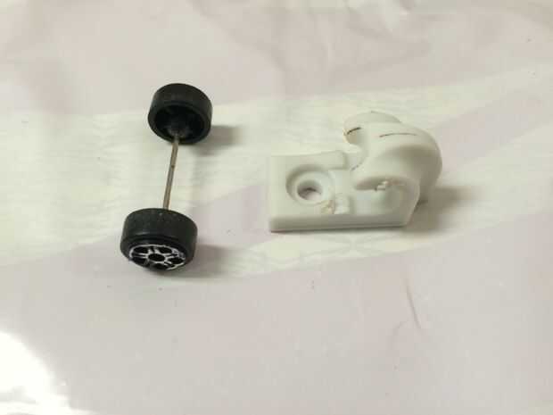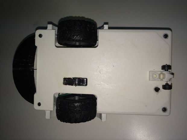 Utilizando un gancho de plástico y ruedas de un coche de juguete (como se muestra arriba), doble cinta o super pegamento a la parte inferior de la impresión 3D de Bottombase (como se muestra en la foto de arriba) para permitir el mejor coche para ir.