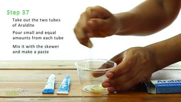 • Verter cantidades pequeñas e iguales de cada tubo y mezclar con el pincho y hacer una pasta.
