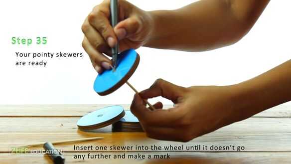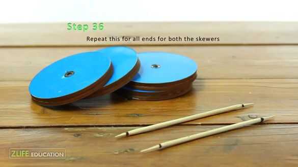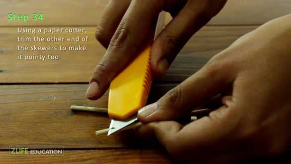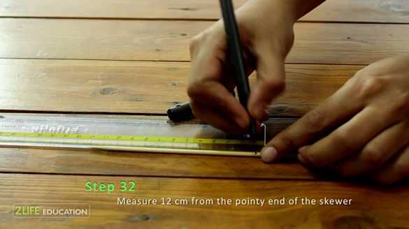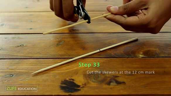 • Ahora mida 12 cm desde el extremo puntiagudo de la brocheta y corte los pinchos en la marca de 12 cm y con un cortador de papel, ajuste el otro extremo de los pinchos para hacerla demasiado puntiagudos.