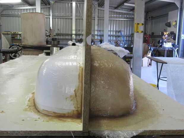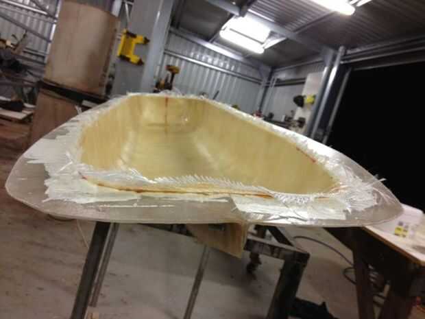 Después de la depilación y la aplicación de molde de pva liberación, una capa de malla tejida y una capa de mate de hebra picado fueron apoyados para arriba en el molde a mano. Un equipo de tres personas hace más fácil completar incluyendo manejo de paño, trabajando rápidamente con resina antes del ajuste y humedecer el paño y eliminar burbujas de aire en la fibra de vidrio. Su un trabajo apestoso, sucio pero son muy pocas alternativas para una piel del cuerpo barato, ligero, fuerte, curvado.