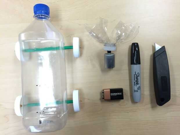Este proceso necesita el cuerpo del coche, motor con la hélice, una batería de 9 voltios, marcador y un cuchillo de la caja.