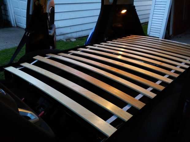 A continuación tuve que averiguar lo que quería usar como base para la cama en el bastidor. Consideré que usando 2 pedazos de madera, uno para la espalda y luego tener el otro para poner en la parte delantera en el lugar. Pero otra vez que sería pesado, no necesita una base sólida y quería algo con un pequeño muelle para dormir más cómodo. Con esto en mente fui con el LURÖY somier base, doble tamaño cama de Ikea. Además de ser mucho más ligero, alrededor de 15 libras, es también toma la mitad de tanto espacio, ya que puedo apretar los listones entre sí debajo del colchón en la parte posterior y luego tire de ellos hacia fuera para cubrir toda la longitud cuando sea necesario.