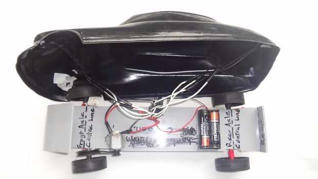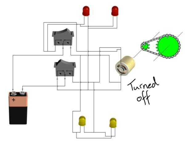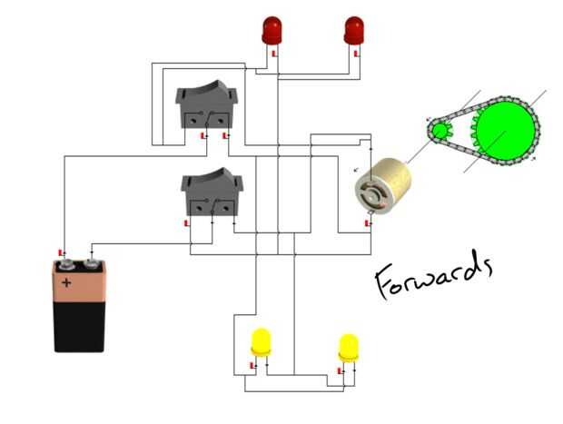 Hay muchas maneras que usted puede hacer esto! Lo hice para que el coche podría viajar hacia delante y hacia atrás, con las luces delanteras en como va hacia delante y la parte trasera luces de como invierte. Esto significó que un interruptor con en (remite) - apagado - en (reverso); así que el servo de rotación continua enganchado dos veces, pero cada uno con polaridad opuesta, así que gira diferentes maneras. Esto es fácil de soldar pero complicado de explicar, sin embargo, podría simplemente tienes un interruptor que cuando convierte en movimiento el coche.